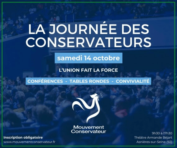 | Vous y rencontrerez des personnalités politiques et des intellectuels de premier plan, venus de Belgique, d’Italie, d’Espagne, du Royaume-Uni, de Pologne, de Hongrie. Vous y rencontrerez Marion Maréchal, notre invitée d’honneur. Vous y rencontrerez des personnes qui, comme vous, pensent que la droite peut et doit sauver la France, et se mettent en ordre de marche pour cela. Venez apporter vos idées à la Journée des Conservateurs en vous inscrivant ! |