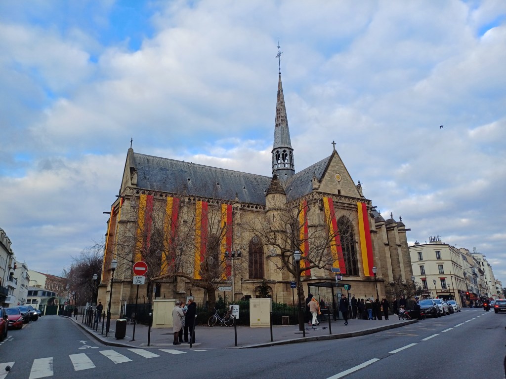 En photo, l’église pavoisée aux couleurs jaune et rouge, couleurs du gouvernement pontifical, héritées de l’ancien Sénat romain, montrant le lien direct entre l’église et le Vatican